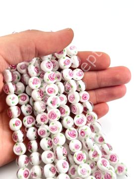 Murano İçten Gül Motifli Dizi Cam Boncuk 10 mm Beyaz